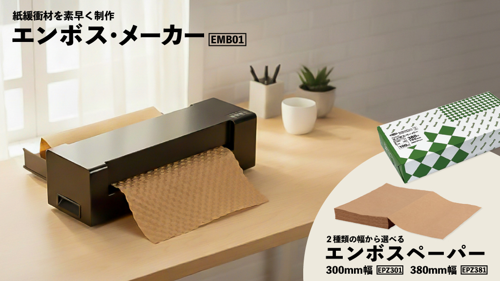 紙に凹凸をつけて緩衝材を作成するエンボスメーカーが登場!面積がかさばりがちな通常の緩衝材とは異なり、必要な時だけ作って使用できるので省スペースで便利です!