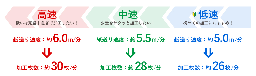 操作パネルを使って加工スピードを選択できます。まず、作業に慣れるまでは低速で、少量や加工枚数を調整するのに便利な中速や、一番早く大量に加工できる高速もあります。