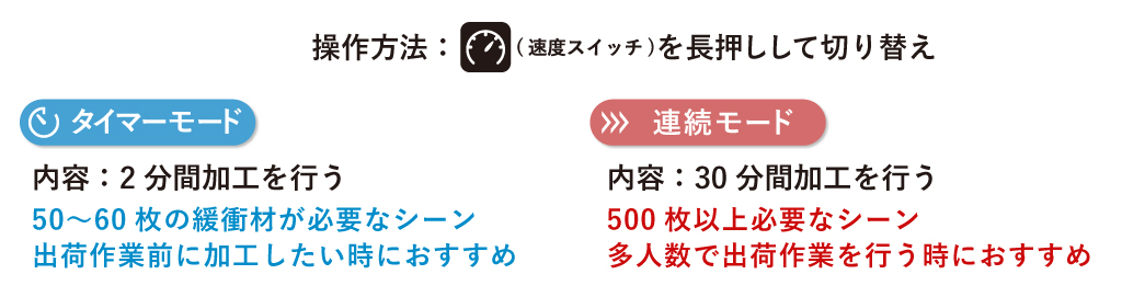 加工時間を2分間と30分間の加工モードから選べます。同じ作業場でも、シーンによって使い分けができます。